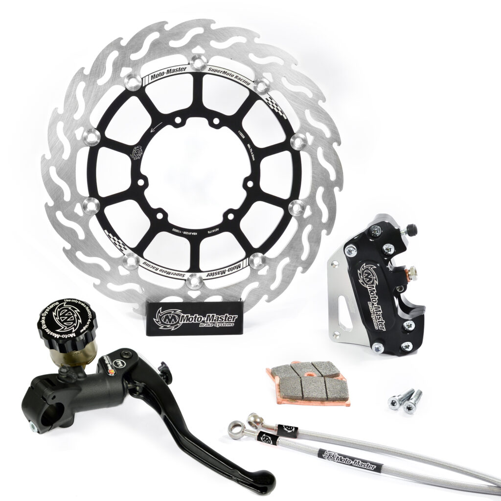 For the ultimate in stopping power, look no further. The Moto-Master Flame Supermoto Racing kit combines all our Supermoto products in one go. This kit was specifically developed for serious Supermoto racing. Now available with rotors in size 300mm or 320mm, and an option of the RMC or RMC-R radial master cylinder